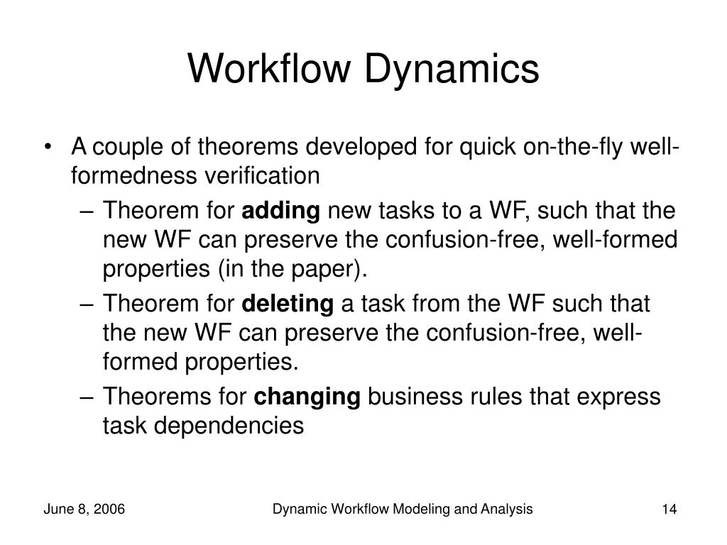 Workflow Dynamics • A couple of theorems developed for quick on-the-fly well-formedness verification • Theorem for adding new tasks to a WF, such that the new WF can preserve the confusion-free, well-formed properties (in the paper). • Theorem for deleting a task from the WF such that the new WF can preserve the confusion-free, well-formed properties. • Theorems for changing business rules that express task dependencies Dynamic Workflow Modeling and Analysis
