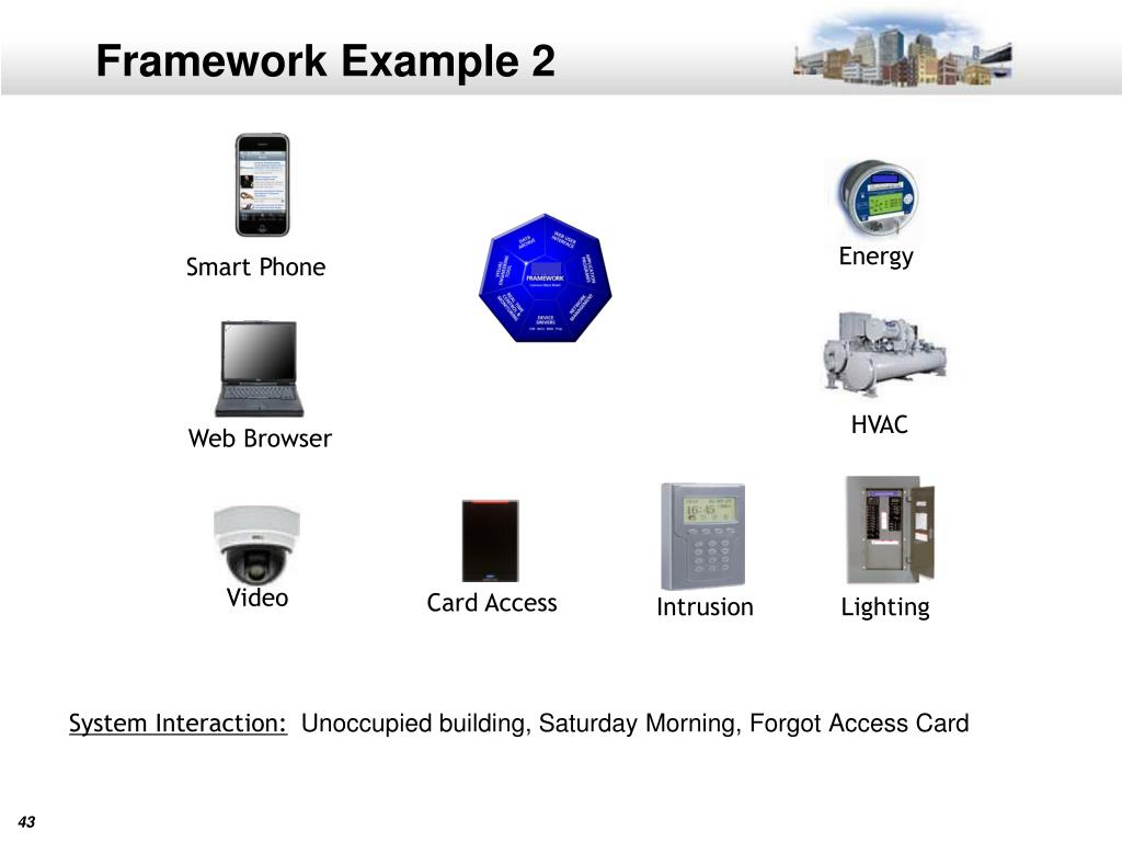 Web Browser Card Access Video Energy Intrusion HVAC Lighting Framework Example 2 Unoccupied building, Saturday Morning, Security un locks door “Email Alarm Received” Smart Phone “Connects to System” “Sees Freezer Door Open” “Verify Employee” “Unlocks Door” System Interaction: