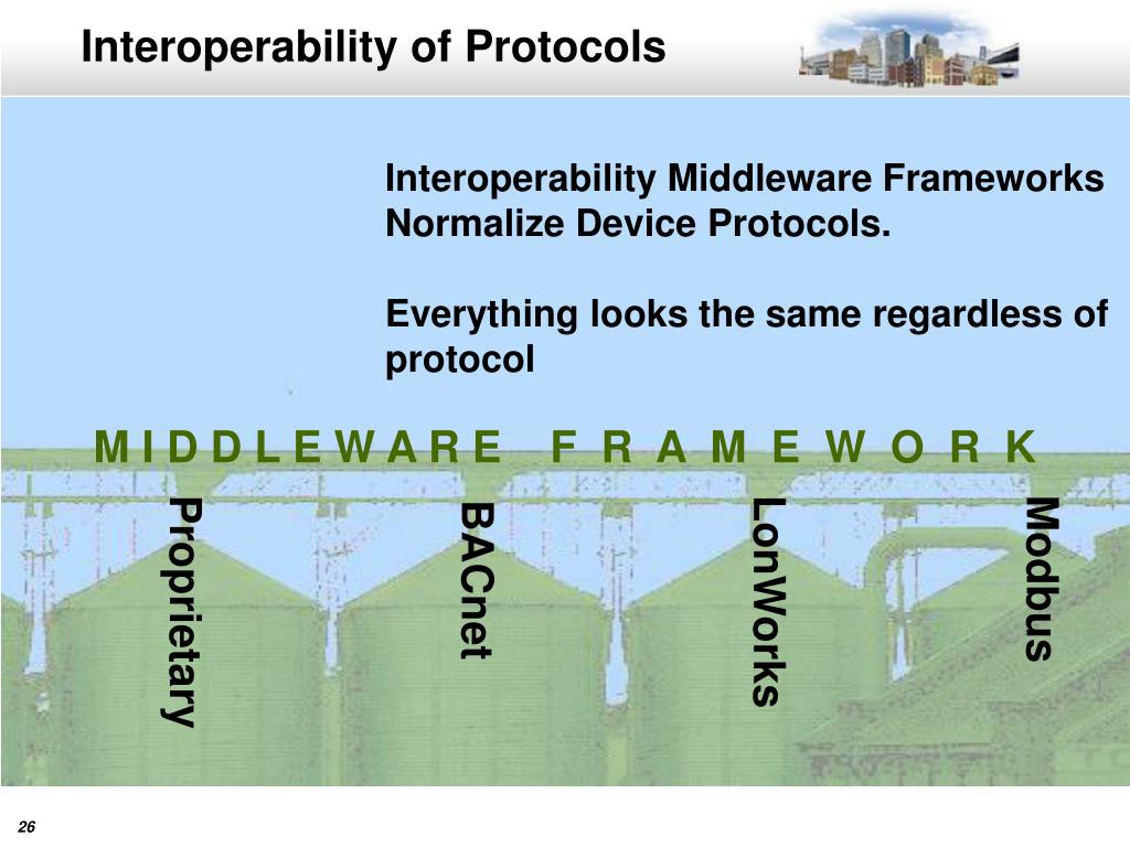 Interoperability of Protocols Interoperability Middleware Frameworks Normalize Device Protocols. Everything looks the same regardless of protocol M I D D L E W A R E F R A M E W O R K Proprietary LonWorks Modbus BACnet