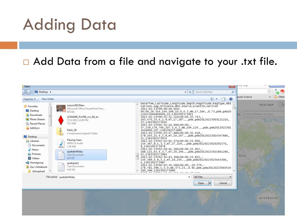 Adding Data • Add Data from a file and navigate to your .txt file.