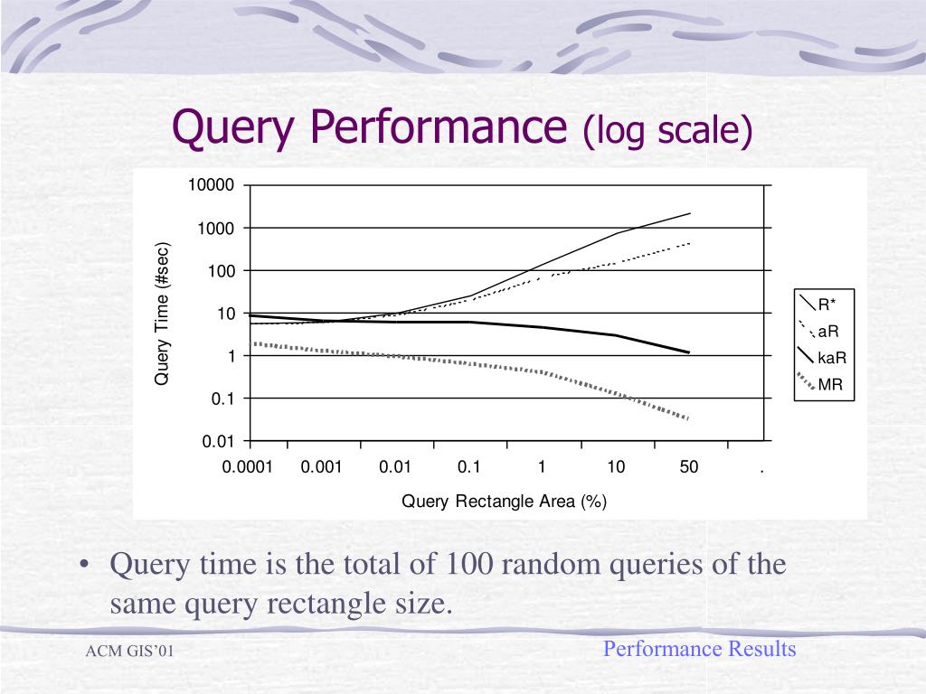 Performance Results • Datasets: 5 million square objects, size randomly chosen from 10 to 10000 (space in each dimension is 1 to one million). • Implemented algorithms: • R*: the R*-tree [BKS+90]; • aR: the aR-tree [PKZ+01, LM01]; • kaR: the aR-tree with k-max optimization; • MR: the MR-tree (with all the optimizations). Performance Results ACM GIS’01