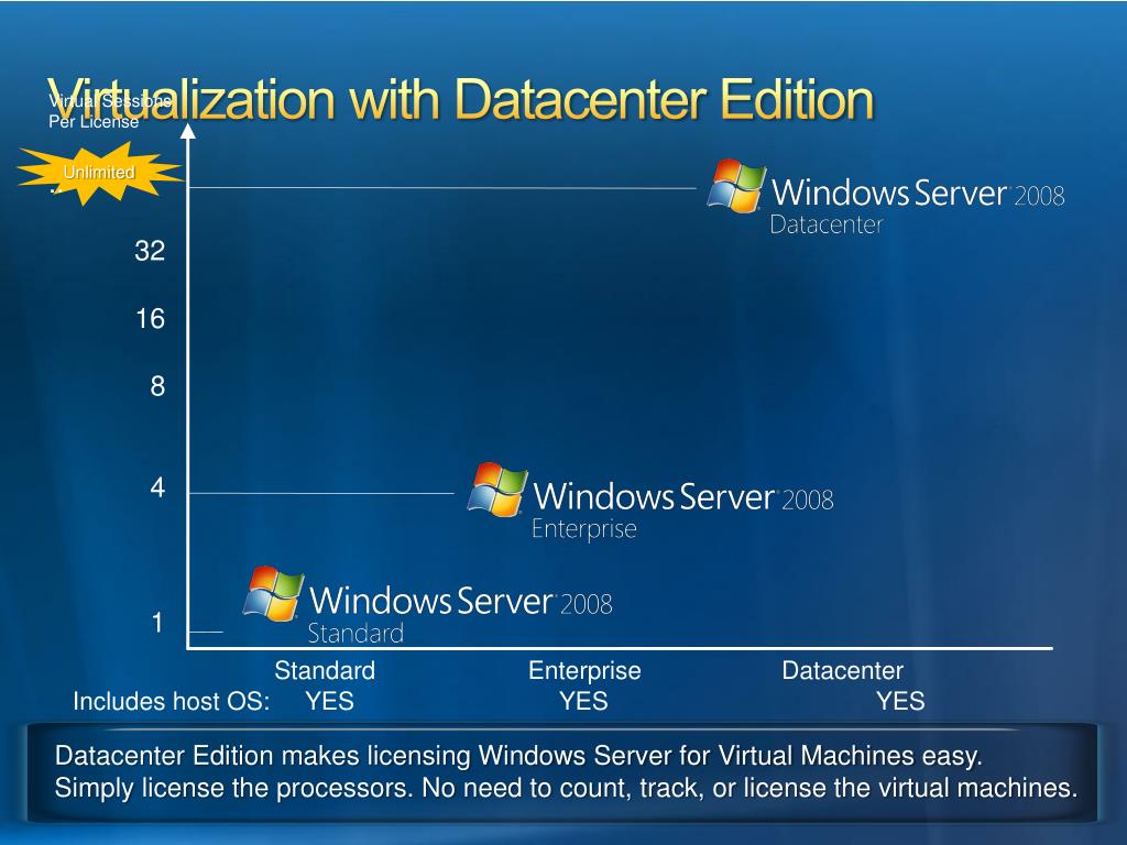 Virtualization with Datacenter Edition Virtual Sessions Per License .. 32 16 8 4 1 Unlimited Standard Enterprise Datacenter Includes host OS: YES YESYES Datacenter Edition makes licensing Windows Server for Virtual Machines easy. Simply license the processors. No need to count, track, or license the virtual machines.