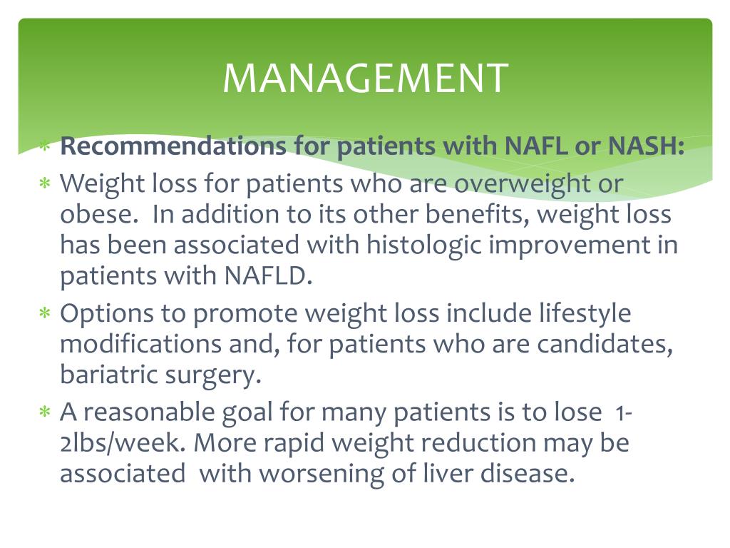 MANAGEMENT Recommendations for patients with NAFL or NASH: Weight loss for patients who are overweight or obese. In addition to its other benefits, weight loss has been associated with histologic improvement in patients with NAFLD. Options to promote weight loss include lifestyle modifications and, for patients who are candidates, bariatric surgery. A reasonable goal for many patients is to lose 1-2lbs/week. More rapid weight reduction may be associated with worsening of liver disease.