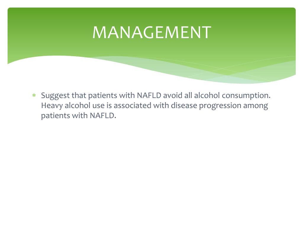 MANAGEMENT • Suggest that patients with NAFLD avoid all alcohol consumption. Heavy alcohol use is associated with disease progression among patients with NAFLD.