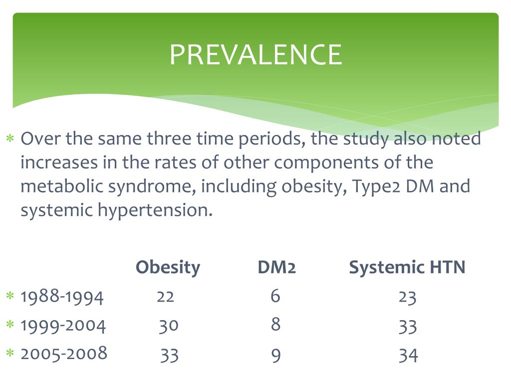 PREVALENCE Over the same three time periods, the study also noted increases in the rates of other components of the metabolic syndrome, including obesity, Type2 DM and systemic hypertension. Obesity DM2Systemic HTN 1988-1994 22 6 23 1999-2004 30 8 33 2005-2008 33 9 34
