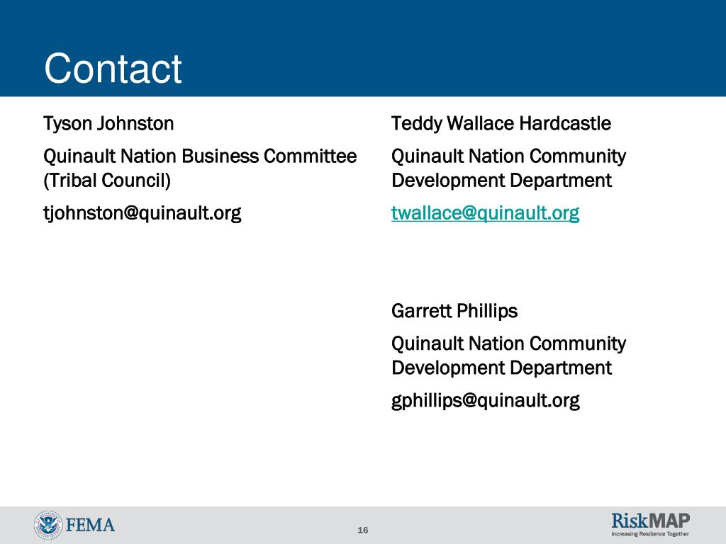 Contact Tyson Johnston Quinault Nation Business Committee (Tribal Council) tjohnston@quinault.org Teddy Wallace Hardcastle Quinault Nation Community Development Department twallace@quinault.org Garrett Phillips Quinault Nation Community Development Department gphillips@quinault.org