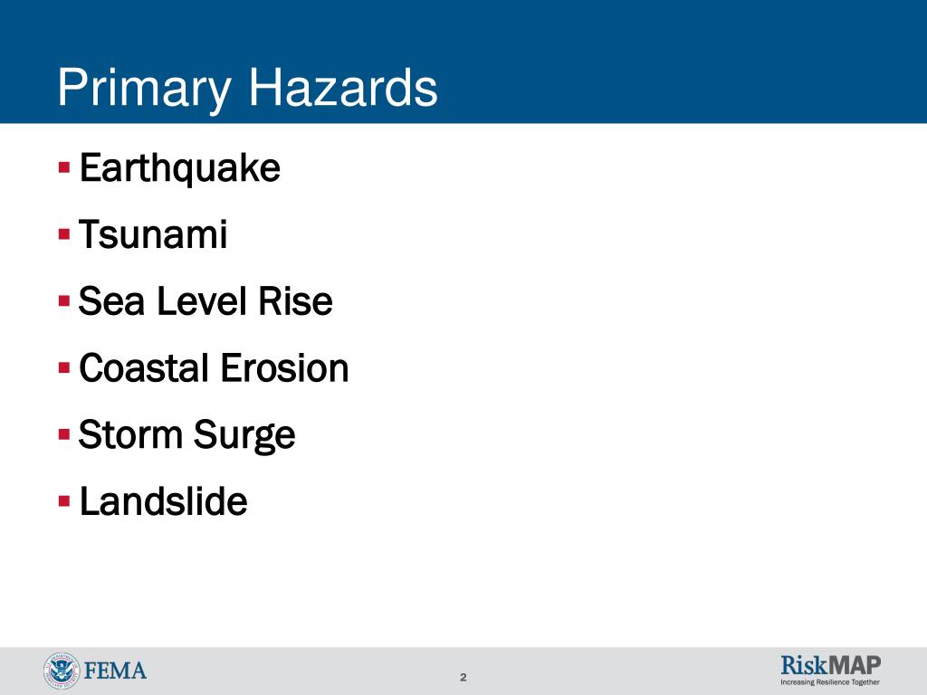 Primary Hazards • Earthquake • Tsunami • Sea Level Rise • Coastal Erosion • Storm Surge • Landslide
