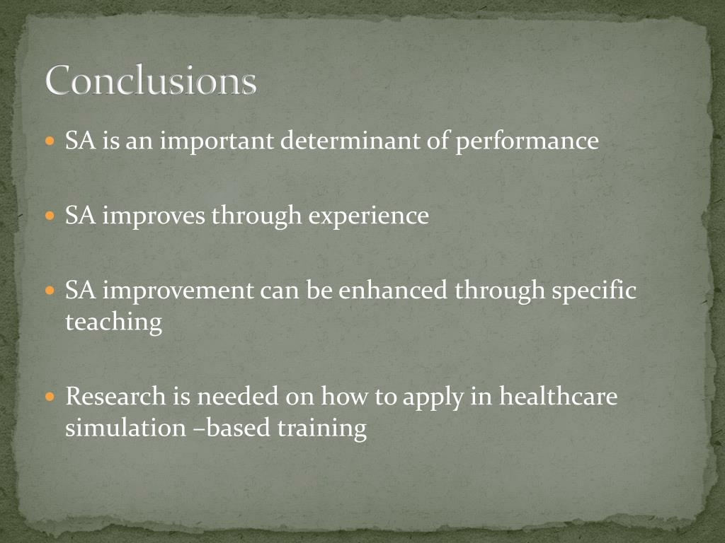 Conclusions • SA is an important determinant of performance • SA improves through experience • SA improvement can be enhanced through specific teaching • Research is needed on how to apply in healthcare simulation –based training