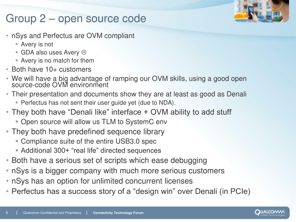 Group 2 – open source code • nSys and Perfectus are OVM compliant • Avery is not • GDA also uses Avery • Avery is no match for them • Both have 10+ customers • We will have a big advantage of ramping our OVM skills, using a good opensource-code OVM environment • Their presentation and documents show they are at least as good as Denali • Perfectus has not sent their user guide yet (due to NDA). • They both have “Denali like” interface + OVM ability to add stuff • Open source will allow us TLM to SystemC env • They both have predefined sequence library • Compliance suite of the entire USB3.0 spec • Additional 300+ “real life” directed sequences • Both have a serious set of scripts which ease debugging • nSys is a bigger company with much more serious customers • nSys has an option for unlimited concurrent licenses • Perfectus has a success story of a “design win” over Denali (in PCIe)