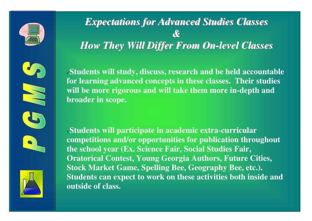 Expectations for Advanced Studies Classes &How They Will Differ From On-level Classes • Students will study, discuss, research and be held accountable for learning advanced concepts in these classes. Their studies will be more rigorous and will take them more in-depth and broader in scope. • Students will participate in academic extra-curricular competitions and/or opportunities for publication throughout the school year (Ex. Science Fair, Social Studies Fair, Oratorical Contest, Young Georgia Authors, Future Cities, Stock Market Game, Spelling Bee, Geography Bee, etc.). Students can expect to work on these activities both inside and outside of class.