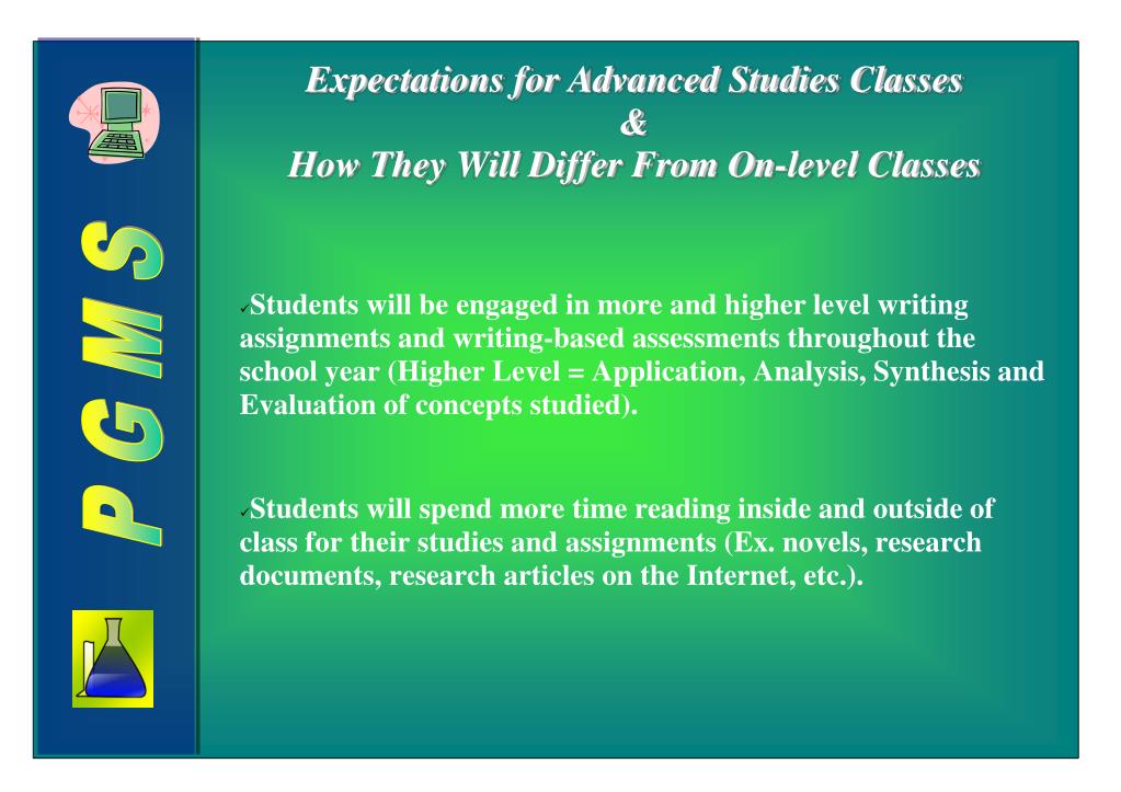 Expectations for Advanced Studies Classes &How They Will Differ From On-level Classes • Students can expect to see more focus and emphasis on refining and polishing their presentation skills, sharing their final projects with authentic audiences and submitting their own work for publication. • Students will be highly encouraged to participate in service-oriented clubs and/or activities at Piney Grove or in the community.