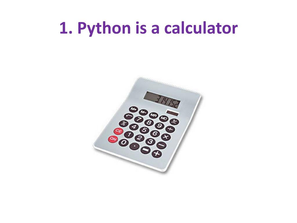 You type expressions.Python computes their values. • 5 • 3+4 • 44/2 • 2**3 • 3*4+5*6 • If precedence is unclear, use parentheses • (72 – 32) / 9 * 5