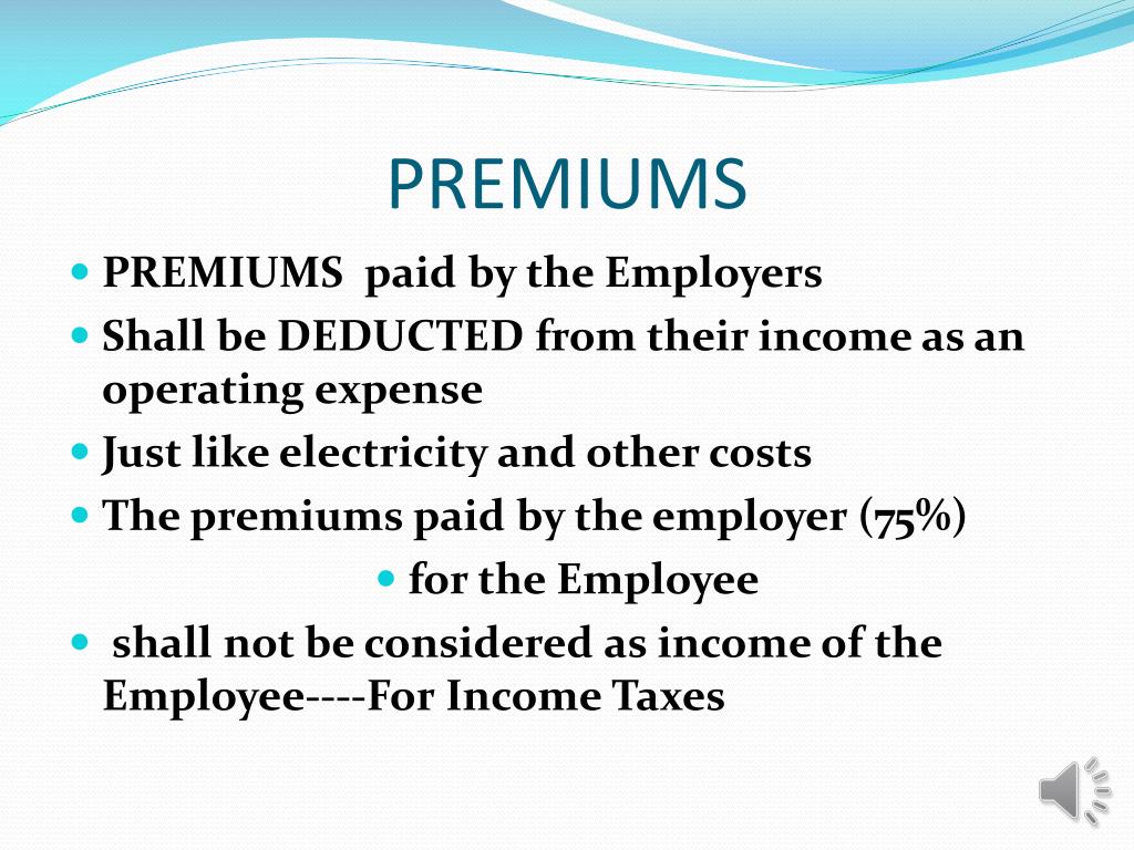 PREMIUMS • PREMIUMS paid by the Employers • Shall be DEDUCTED from their income as an operating expense • Just like electricity and other costs • The premiums paid by the employer (75%) • for the Employee • shall not be considered as income of the Employee----For Income Taxes