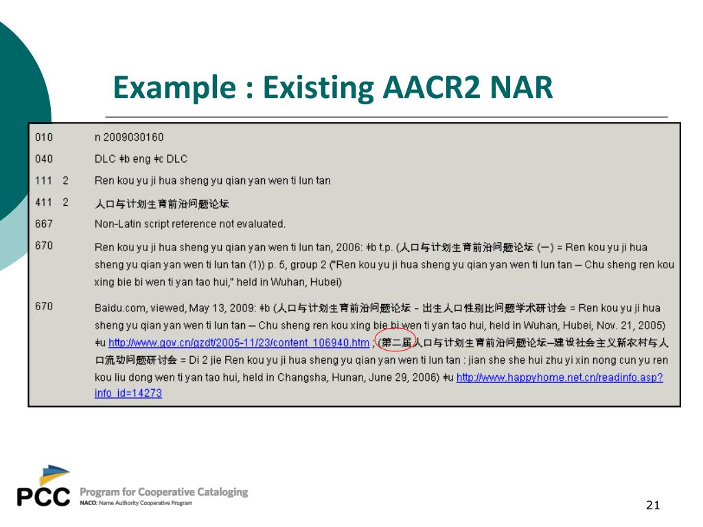 Conference Names : Ongoing (11.13.1.8) • Separate authority records for collective conference and individual instance may coexist • Earlier/Later names are put in 5XX fields in the NAR for the collective conference • A 667 is used on the collective record when there are also individual records for the conference • Include frequency word in the NAR for conference • Do not re-use the existing collective conference NAR for individual instance