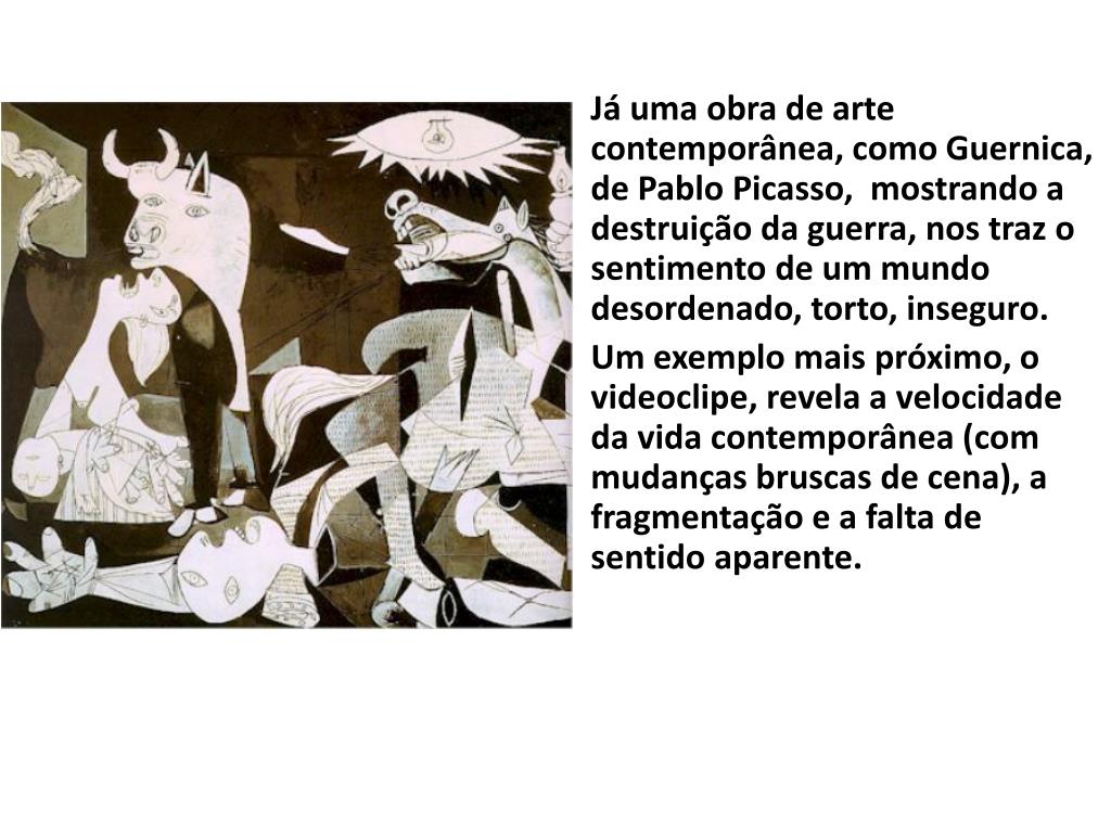 Já uma obra de arte contemporânea, como Guernica, de Pablo Picasso, mostrando a destruição da guerra, nos traz o sentimento de um mundo desordenado, torto, inseguro. • Um exemplo mais próximo, o videoclipe, revela a velocidade da vida contemporânea (com mudanças bruscas de cena), a fragmentação e a falta de sentido aparente.