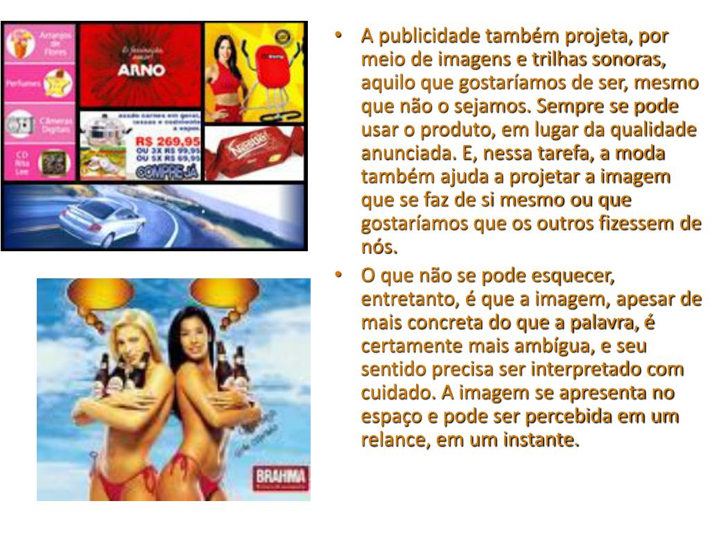 A publicidade também projeta, por meio de imagens e trilhas sonoras, aquilo que gostaríamos de ser, mesmo que não o sejamos. Sempre se pode usar o produto, em lugar da qualidade anunciada. E, nessa tarefa, a moda também ajuda a projetar a imagem que se faz de si mesmo ou que gostaríamos que os outros fizessem de nós. • O que não se pode esquecer, entretanto, é que a imagem, apesar de mais concreta do que a palavra, é certamente mais ambígua, e seu sentido precisa ser interpretado com cuidado. A imagem se apresenta no espaço e pode ser percebida em um relance, em um instante.