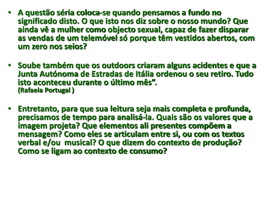 A questão séria coloca-se quando pensamos a fundo no significado disto. O que isto nos diz sobre o nosso mundo? Que ainda vê a mulher como objecto sexual, capaz de fazer disparar as vendas de um telemóvel só porque têm vestidos abertos, com um zero nos seios? • Soube também que os outdoors criaram alguns acidentes e que a Junta Autónoma de Estradas de Itália ordenou o seu retiro. Tudo isto aconteceu durante o último mês”.(Rafaela Portugal ) • Entretanto, para que sua leitura seja mais completa e profunda, precisamos de tempo para analisá-la. Quais são os valores que a imagem projeta? Que elementos ali presentes compõem a mensagem? Como eles se articulam entre si, ou com os textos verbal e/ou musical? O que dizem do contexto de produção? Como se ligam ao contexto de consumo?