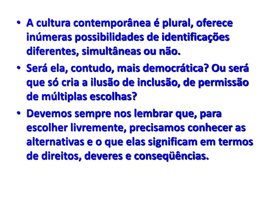 A cultura contemporânea é plural, oferece inúmeras possibilidades de identificações diferentes, simultâneas ou não. • Será ela, contudo, mais democrática? Ou será que só cria a ilusão de inclusão, de permissão de múltiplas escolhas? • Devemos sempre nos lembrar que, para escolher livremente, precisamos conhecer as alternativas e o que elas significam em termos de direitos, deveres e conseqüências.