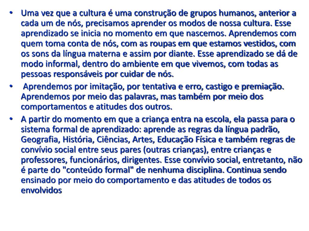 Uma vez que a cultura é uma construção de grupos humanos, anterior a cada um de nós, precisamos aprender os modos de nossa cultura. Esse aprendizado se inicia no momento em que nascemos. Aprendemos com quem toma conta de nós, com as roupas em que estamos vestidos, com os sons da língua materna e assim por diante. Esse aprendizado se dá de modo informal, dentro do ambiente em que vivemos, com todas as pessoas responsáveis por cuidar de nós. • Aprendemos por imitação, por tentativa e erro, castigo e premiação. Aprendemos por meio das palavras, mas também por meio dos comportamentos e atitudes dos outros. • A partir do momento em que a criança entra na escola, ela passa para o sistema formal de aprendizado: aprende as regras da língua padrão, Geografia, História, Ciências, Artes, Educação Física e também regras de convívio social entre seus pares (outras crianças), entre crianças e professores, funcionários, dirigentes. Esse convívio social, entretanto, não é parte do "conteúdo formal" de nenhuma disciplina. Continua sendo ensinado por meio do comportamento e das atitudes de todos os envolvidos