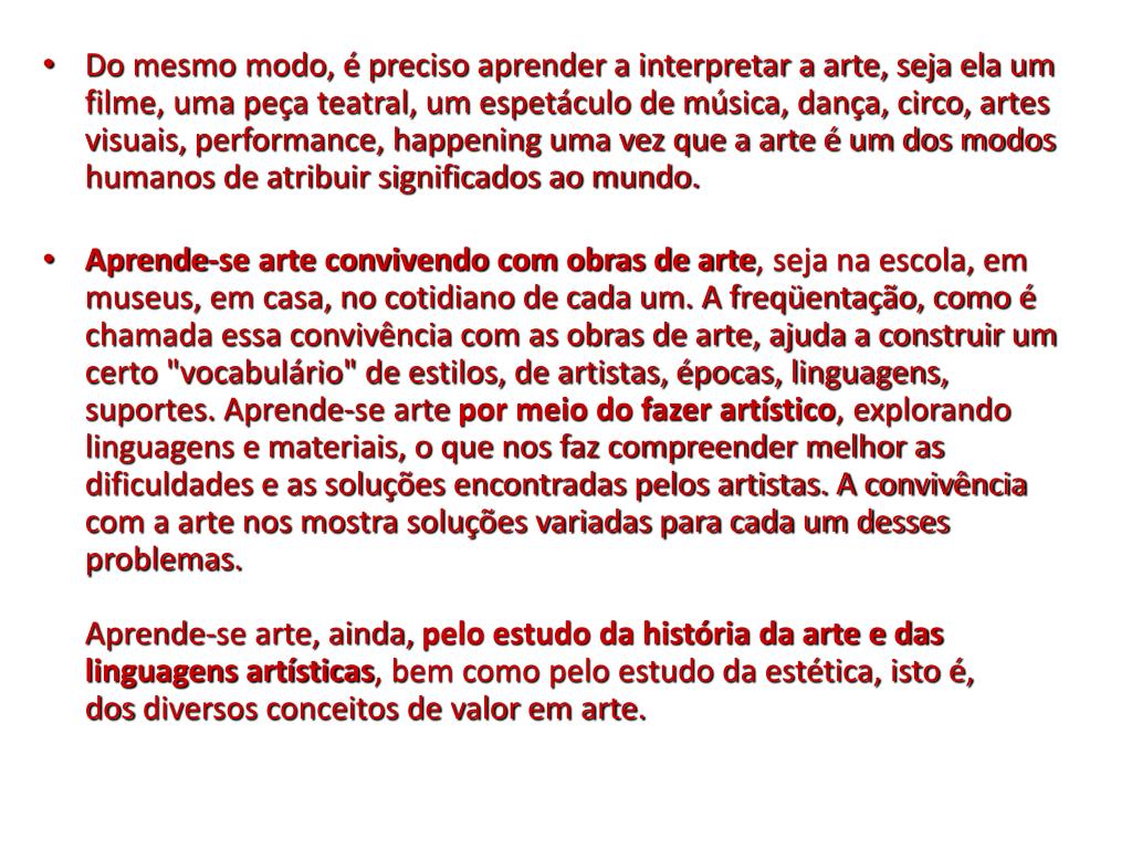 Do mesmo modo, é preciso aprender a interpretar a arte, seja ela um filme, uma peça teatral, um espetáculo de música, dança, circo, artes visuais, performance, happening uma vez que a arte é um dos modos humanos de atribuir significados ao mundo. • Aprende-se arte convivendo com obras de arte, seja na escola, em museus, em casa, no cotidiano de cada um. A freqüentação, como é chamada essa convivência com as obras de arte, ajuda a construir um certo "vocabulário" de estilos, de artistas, épocas, linguagens, suportes. Aprende-se arte por meio do fazer artístico, explorando linguagens e materiais, o que nos faz compreender melhor as dificuldades e as soluções encontradas pelos artistas. A convivência com a arte nos mostra soluções variadas para cada um desses problemas. Aprende-se arte, ainda, pelo estudo da história da arte e das linguagens artísticas, bem como pelo estudo da estética, isto é, dos diversos conceitos de valor em arte.