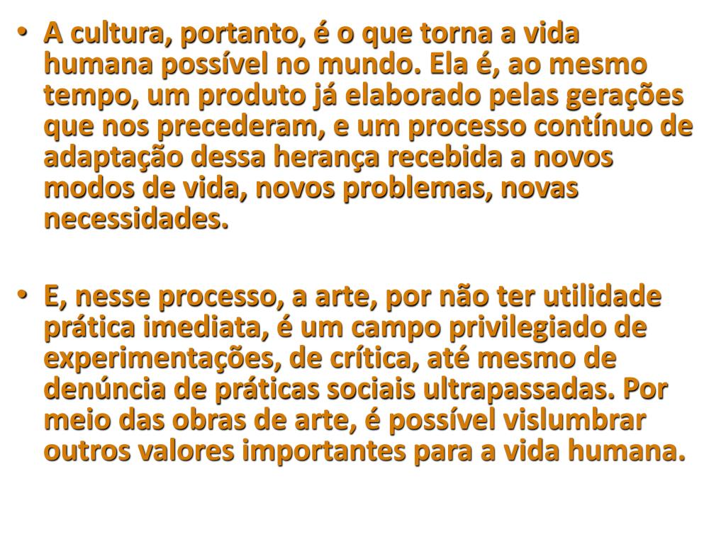 A cultura, portanto, é o que torna a vida humana possível no mundo. Ela é, ao mesmo tempo, um produto já elaborado pelas gerações que nos precederam, e um processo contínuo de adaptação dessa herança recebida a novos modos de vida, novos problemas, novas necessidades. • E, nesse processo, a arte, por não ter utilidade prática imediata, é um campo privilegiado de experimentações, de crítica, até mesmo de denúncia de práticas sociais ultrapassadas. Por meio das obras de arte, é possível vislumbrar outros valores importantes para a vida humana.