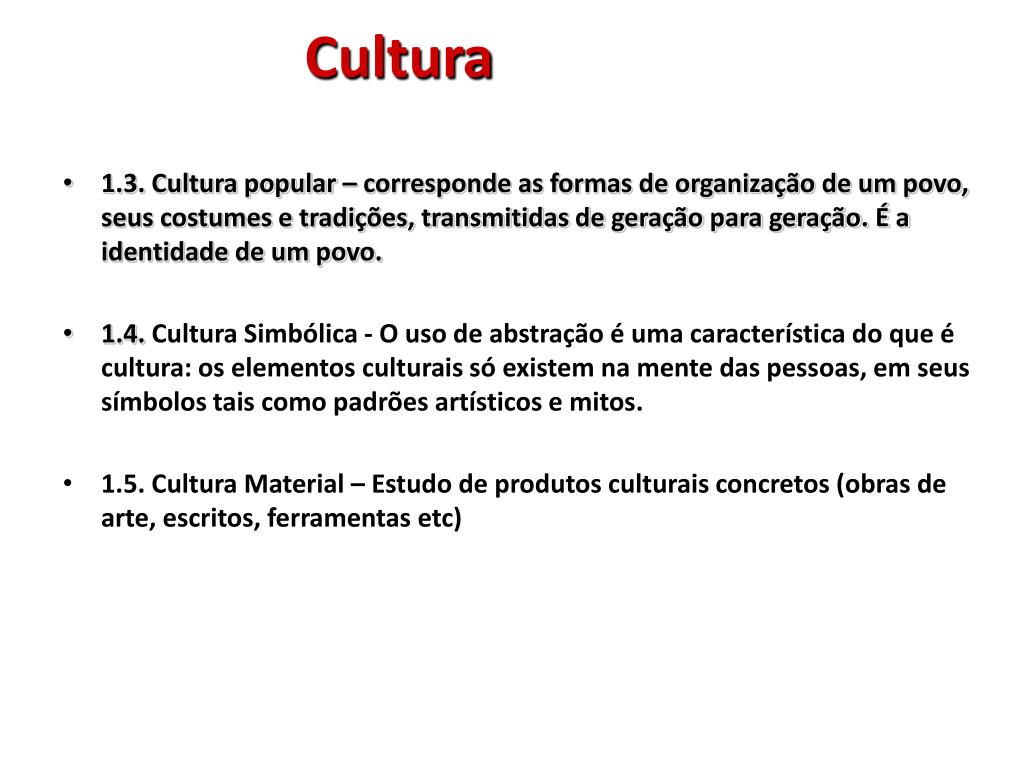 Cultura • 1.3. Cultura popular – corresponde as formas de organização de um povo, seus costumes e tradições, transmitidas de geração para geração. É a identidade de um povo. • 1.4. Cultura Simbólica - O uso de abstração é uma característica do que é cultura: os elementos culturais só existem na mente das pessoas, em seus símbolos tais como padrões artísticos e mitos. • 1.5. Cultura Material – Estudo de produtos culturais concretos (obras de arte, escritos, ferramentas etc)