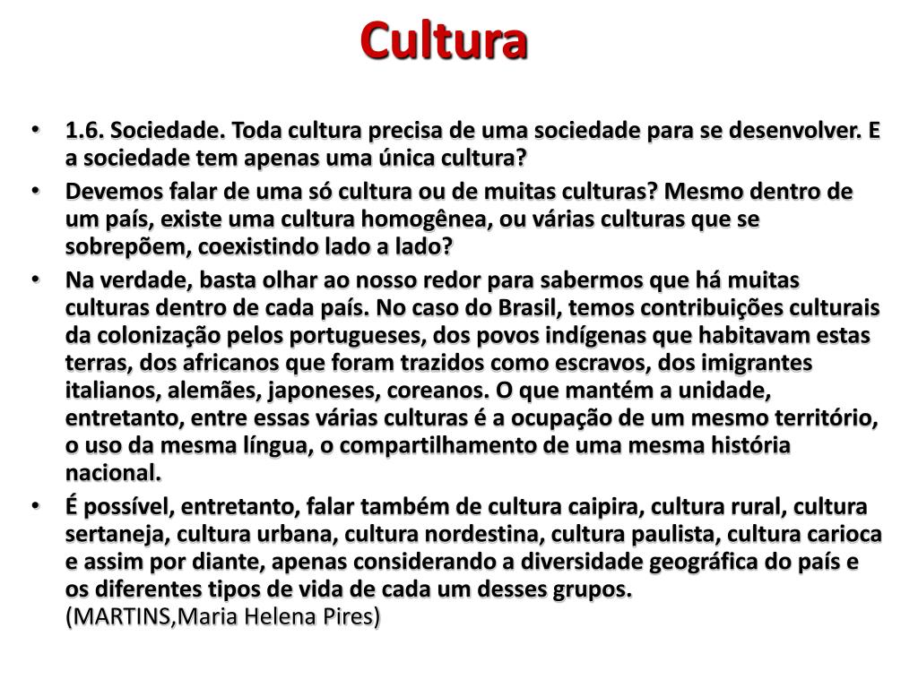 Cultura • 1.6. Sociedade. Toda cultura precisa de uma sociedade para se desenvolver. E a sociedade tem apenas uma única cultura? • Devemos falar de uma só cultura ou de muitas culturas? Mesmo dentro de um país, existe uma cultura homogênea, ou várias culturas que se sobrepõem, coexistindo lado a lado? • Na verdade, basta olhar ao nosso redor para sabermos que há muitas culturas dentro de cada país. No caso do Brasil, temos contribuições culturais da colonização pelos portugueses, dos povos indígenas que habitavam estas terras, dos africanos que foram trazidos como escravos, dos imigrantes italianos, alemães, japoneses, coreanos. O que mantém a unidade, entretanto, entre essas várias culturas é a ocupação de um mesmo território, o uso da mesma língua, o compartilhamento de uma mesma história nacional. • É possível, entretanto, falar também de cultura caipira, cultura rural, cultura sertaneja, cultura urbana, cultura nordestina, cultura paulista, cultura carioca e assim por diante, apenas considerando a diversidade geográfica do país e os diferentes tipos de vida de cada um desses grupos. (MARTINS,Maria Helena Pires)