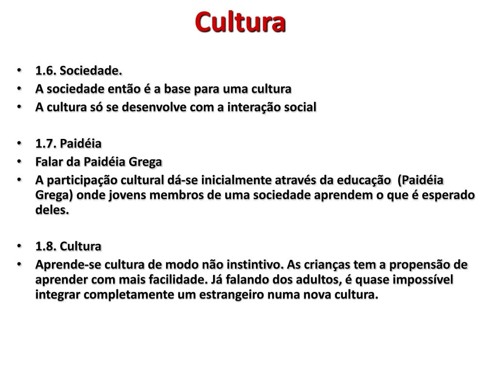 Cultura • 1.6. Sociedade. • A sociedade então é a base para uma cultura • A cultura só se desenvolve com a interação social • 1.7. Paidéia • Falar da Paidéia Grega • A participação cultural dá-se inicialmente através da educação (Paidéia Grega) onde jovens membros de uma sociedade aprendem o que é esperado deles. • 1.8. Cultura • Aprende-se cultura de modo não instintivo. As crianças tem a propensão de aprender com mais facilidade. Já falando dos adultos, é quase impossível integrar completamente um estrangeiro numa nova cultura.