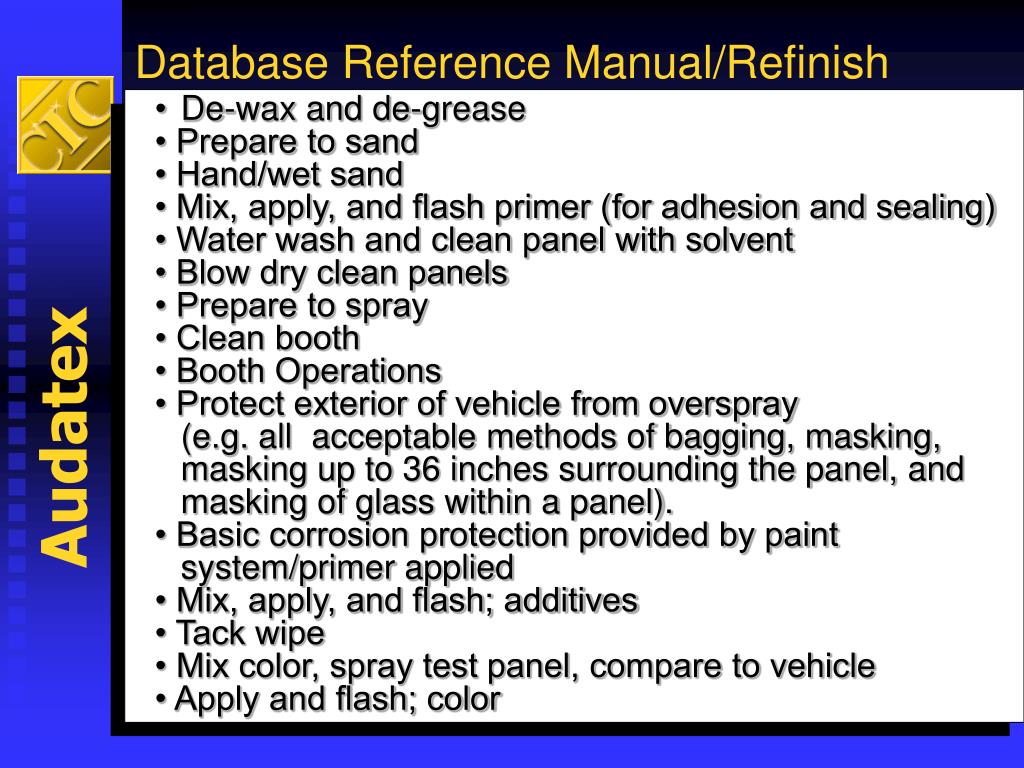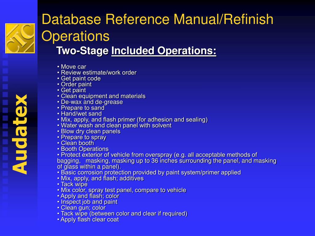 Database Reference Manual/Refinish Operations Two-Stage Included Operations: • Move car • Review estimate/work order • Get paint code • Order paint • Get paint • Clean equipment and materials • De-wax and de-grease • Prepare to sand • Hand/wet sand • Mix, apply, and flash primer (for adhesion and sealing) • Water wash and clean panel with solvent • Blow dry clean panels • Prepare to spray • Clean booth • Booth Operations • Protect exterior of vehicle from overspray (e.g. all acceptable methods of bagging, masking, masking up to 36 inches surrounding the panel, and masking of glass within a panel). • Basic corrosion protection provided by paint system/primer applied • Mix, apply, and flash; additives • Tack wipe • Mix color, spray test panel, compare to vehicle • Apply and flash; color • Inspect job and paint • Clean gun; color • Tack wipe (between color and clear if required) • Apply flash clear coat Audatex