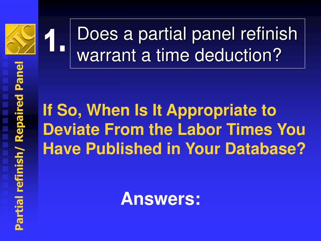 Does a partial panel refinish warrant a time deduction? If So, When Is It Appropriate to Deviate From the Labor Times You Have Published in Your Database? 1. Partial refinish/ Repaired Panel Answers: