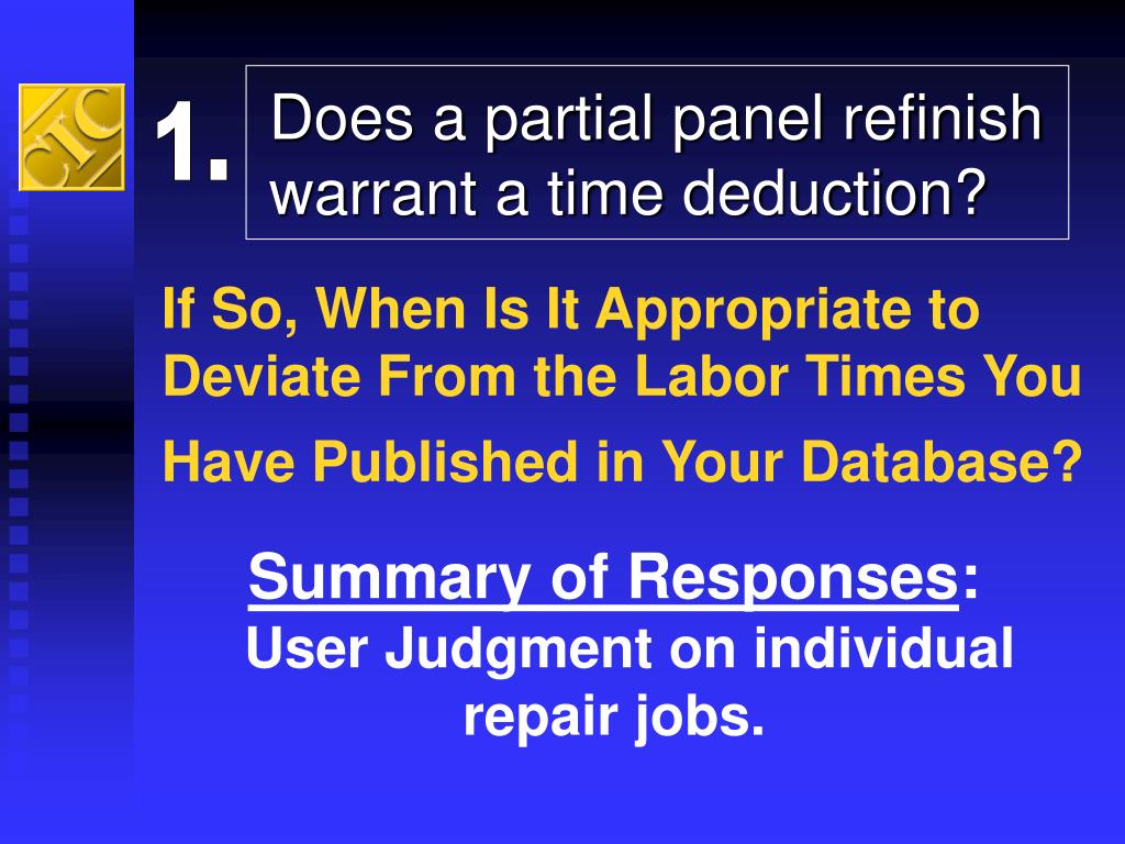 Does a partial panel refinish warrant a time deduction? If So, When Is It Appropriate to Deviate From the Labor Times You Have Published in Your Database? 1. Summary of Responses: User Judgment on individual repair jobs.