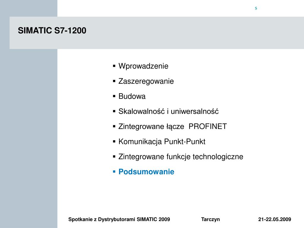 SIMATIC S7-1200. SIMATIC S7-1200. SIMATIC S7-1200. Wprowadzenie. Zaszeregowanie. Budowa. Skalowalność i uniwersalność. Zintegrowane łącze PROFINET. Komunikacja Punkt-Punkt. Zintegrowane funkcje technologiczne. Podsumowanie. Wzajemna współpraca stwarza nowe możliwości.