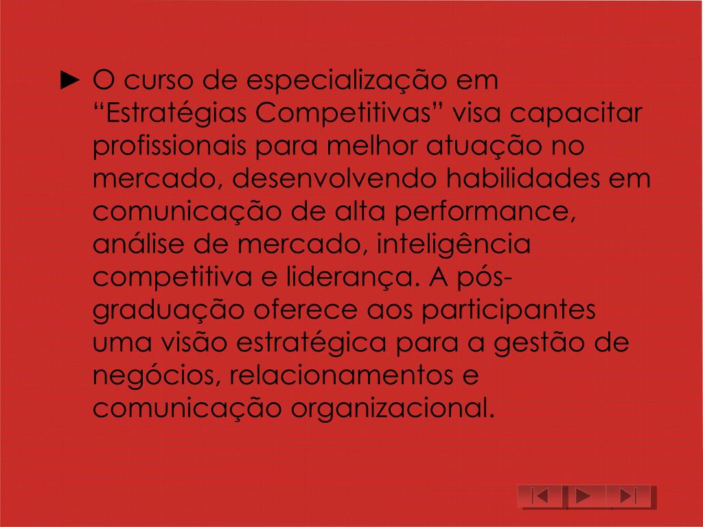 O curso de especialização em “Estratégias Competitivas” visa capacitar profissionais para melhor atuação no mercado, desenvolvendo habilidades em comunicação de alta performance, análise de mercado, inteligência competitiva e liderança. A pós-graduação oferece aos participantes uma visão estratégica para a gestão de negócios, relacionamentos e comunicação organizacional.