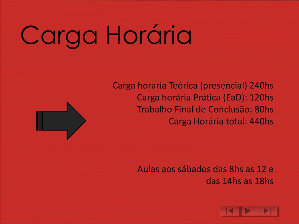 Carga Horária Carga horaria Teórica (presencial) 240hs Carga horária Prática (EaD): 120hs Trabalho Final de Conclusão: 80hs Carga Horária total: 440hs Aulas aos sábados das 8hs as 12 e das 14hs as 18hs
