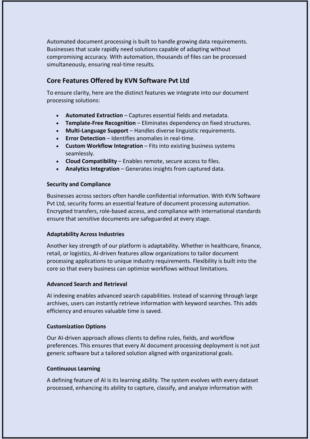 Automated document processing is built to handle growing data requirements. Businesses that scale rapidly need solutions capable of adapting without compromising accuracy. With automation, thousands of files can be processed simultaneously, ensuring real-time results. Core Features Offered by KVN Software Pvt Ltd To ensure clarity, here are the distinct features we integrate into our document processing solutions: Automated Extraction – Captures essential fields and metadata. Template-Free Recognition – Eliminates dependency on fixed structures. Multi-Language Support – Handles diverse linguistic requirements. Error Detection – Identifies anomalies in real-time. Custom Workflow Integration – Fits into existing business systems seamlessly. Cloud Compatibility – Enables remote, secure access to files. Analytics Integration – Generates insights from captured data. Security and Compliance Businesses across sectors often handle confidential information. With KVN Software Pvt Ltd, security forms an essential feature of document processing automation. Encrypted transfers, role-based access, and compliance with international standards ensure that sensitive documents are safeguarded at every stage. Adaptability Across Industries Another key strength of our platform is adaptability. Whether in healthcare, finance, retail, or logistics, AI-driven features allow organizations to tailor document processing applications to unique industry requirements. Flexibility is built into the core so that every business can optimize workflows without limitations. Advanced Search and Retrieval AI indexing enables advanced search capabilities. Instead of scanning through large archives, users can instantly retrieve information with keyword searches. This adds efficiency and ensures valuable time is saved. Customization Options Our AI-driven approach allows clients to define rules, fields, and workflow preferences. This ensures that every AI document processing deployment is not just generic software but a tailored solution aligned with organizational goals. Continuous Learning A defining feature of AI is its learning ability. The system evolves with every dataset processed, enhancing its ability to capture, classify, and analyze information with