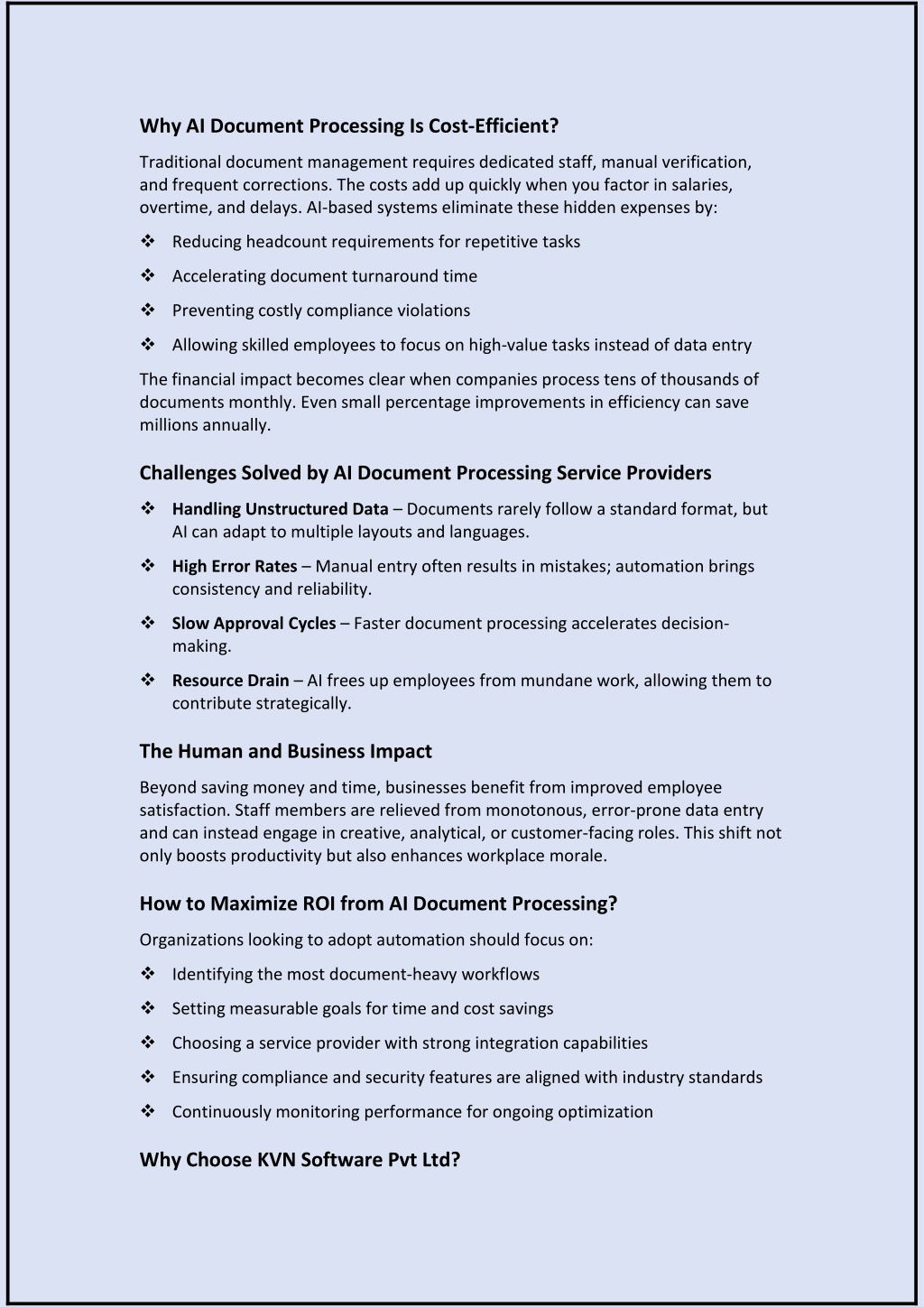 Why AI Document Processing Is Cost-Efficient? Traditional document management requires dedicated staff, manual verification, and frequent corrections. The costs add up quickly when you factor in salaries, overtime, and delays. AI-based systems eliminate these hidden expenses by: Reducing headcount requirements for repetitive tasks Accelerating document turnaround time Preventing costly compliance violations Allowing skilled employees to focus on high-value tasks instead of data entry The financial impact becomes clear when companies process tens of thousands of documents monthly. Even small percentage improvements in efficiency can save millions annually. Challenges Solved by AI Document Processing Service Providers Handling Unstructured Data – Documents rarely follow a standard format, but AI can adapt to multiple layouts and languages. High Error Rates – Manual entry often results in mistakes; automation brings consistency and reliability. Slow Approval Cycles – Faster document processing accelerates decision- making. Resource Drain – AI frees up employees from mundane work, allowing them to contribute strategically. The Human and Business Impact Beyond saving money and time, businesses benefit from improved employee satisfaction. Staff members are relieved from monotonous, error-prone data entry and can instead engage in creative, analytical, or customer-facing roles. This shift not only boosts productivity but also enhances workplace morale. How to Maximize ROI from AI Document Processing? Organizations looking to adopt automation should focus on: Identifying the most document-heavy workflows Setting measurable goals for time and cost savings Choosing a service provider with strong integration capabilities Ensuring compliance and security features are aligned with industry standards Continuously monitoring performance for ongoing optimization Why Choose KVN Software Pvt Ltd?