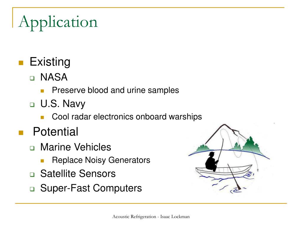 Application • Existing • NASA • Preserve blood and urine samples • U.S. Navy • Cool radar electronics onboard warships • Potential • Marine Vehicles • Replace Noisy Generators • Satellite Sensors • Super-Fast Computers Acoustic Refrigeration - Isaac Lockman