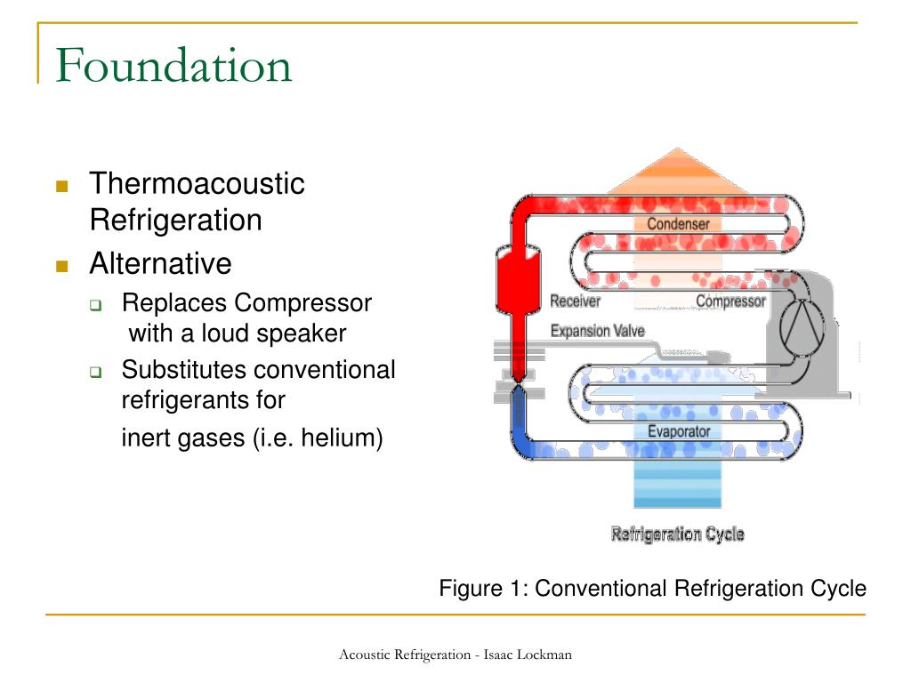 Acoustic Refrigeration. Isaac Lockman. Foundation. Thermoacoustic Refrigeration Alternative Replaces Compressor with a loud speaker Substitutes conventional refrigerants for inert gases (i.e. helium). Figure 1: Conventional Refrigeration Cycle. Operation.