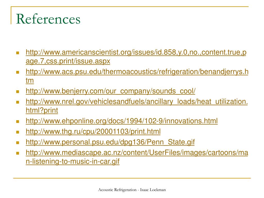 References • http://www.americanscientist.org/issues/id.858,y.0,no.,content.true,page.7,css.print/issue.aspx • http://www.acs.psu.edu/thermoacoustics/refrigeration/benandjerrys.htm • http://www.benjerry.com/our_company/sounds_cool/ • http://www.nrel.gov/vehiclesandfuels/ancillary_loads/heat_utilization.html?print • http://www.ehponline.org/docs/1994/102-9/innovations.html • http://www.thg.ru/cpu/20001103/print.html • http://www.personal.psu.edu/dpg136/Penn_State.gif • http://www.mediascape.ac.nz/content/UserFiles/images/cartoons/man-listening-to-music-in-car.gif Acoustic Refrigeration - Isaac Lockman