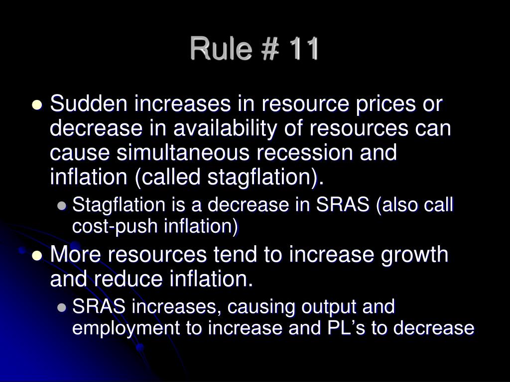 Rule # 11 • Sudden increases in resource prices or decrease in availability of resources can cause simultaneous recession and inflation (called stagflation). • Stagflation is a decrease in SRAS (also call cost-push inflation) • More resources tend to increase growth and reduce inflation. • SRAS increases, causing output and employment to increase and PL’s to decrease
