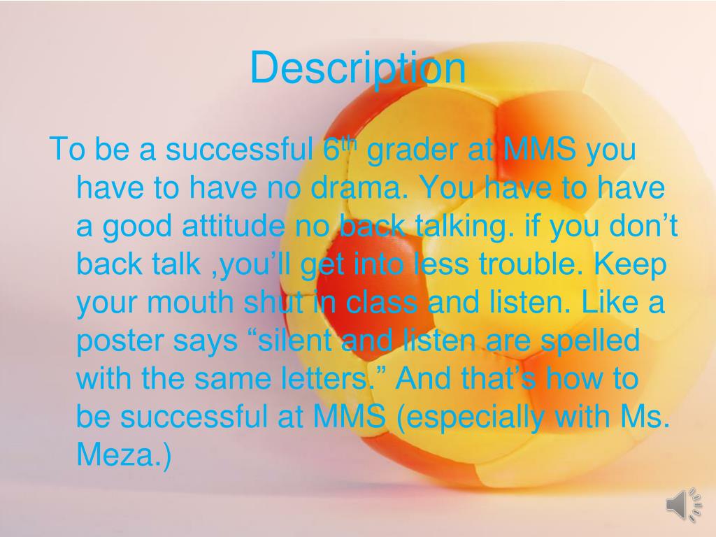 Description To be a successful 6th grader at MMS you have to have no drama. You have to have a good attitude no back talking. if you don’t back talk ,you’ll get into less trouble. Keep your mouth shut in class and listen. Like a poster says “silent and listen are spelled with the same letters.” And that’s how to be successful at MMS (especially with Ms. Meza.)