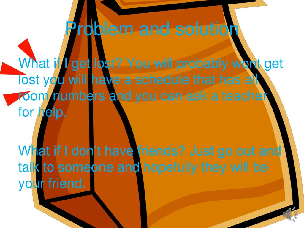 Problem and solution What if I get lost? You will probably wont get lost you will have a schedule that has all room numbers and you can ask a teacher for help. What if I don’t have friends? Just go out and talk to someone and hopefully they will be your friend.
