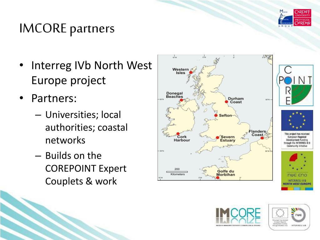 IMCORE partners • Interreg IVb North West Europe project • Partners: • Universities; local authorities; coastal networks • Builds on the COREPOINT Expert Couplets & work
