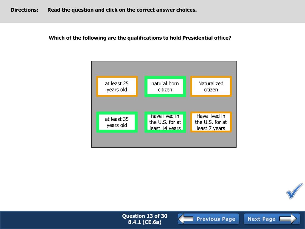 Directions: Read the question and click on the correct answer choices. Which of the following are the qualifications to hold Presidential office? at least 25 years old natural born citizen Naturalized citizen at least 35 years old have lived in the U.S. for at least 14 years Have lived in the U.S. for at least 7 years Question 13 of 30 8.4.1 (CE.6a) Previous Page Next Page
