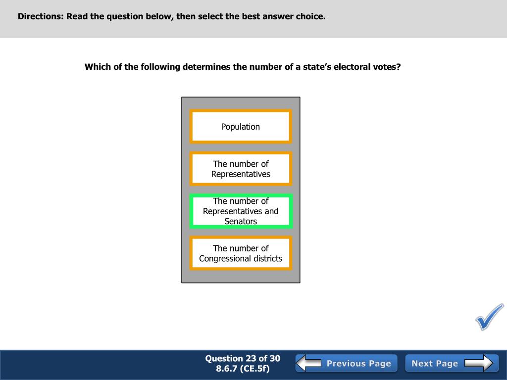 Directions: Read the question below, then select the best answer choice. Which of the following determines the number of a state’s electoral votes? Population The number of Representatives The number of Representatives and Senators The number of Congressional districts Question 23 of 30 8.6.7 (CE.5f) Previous Page Next Page