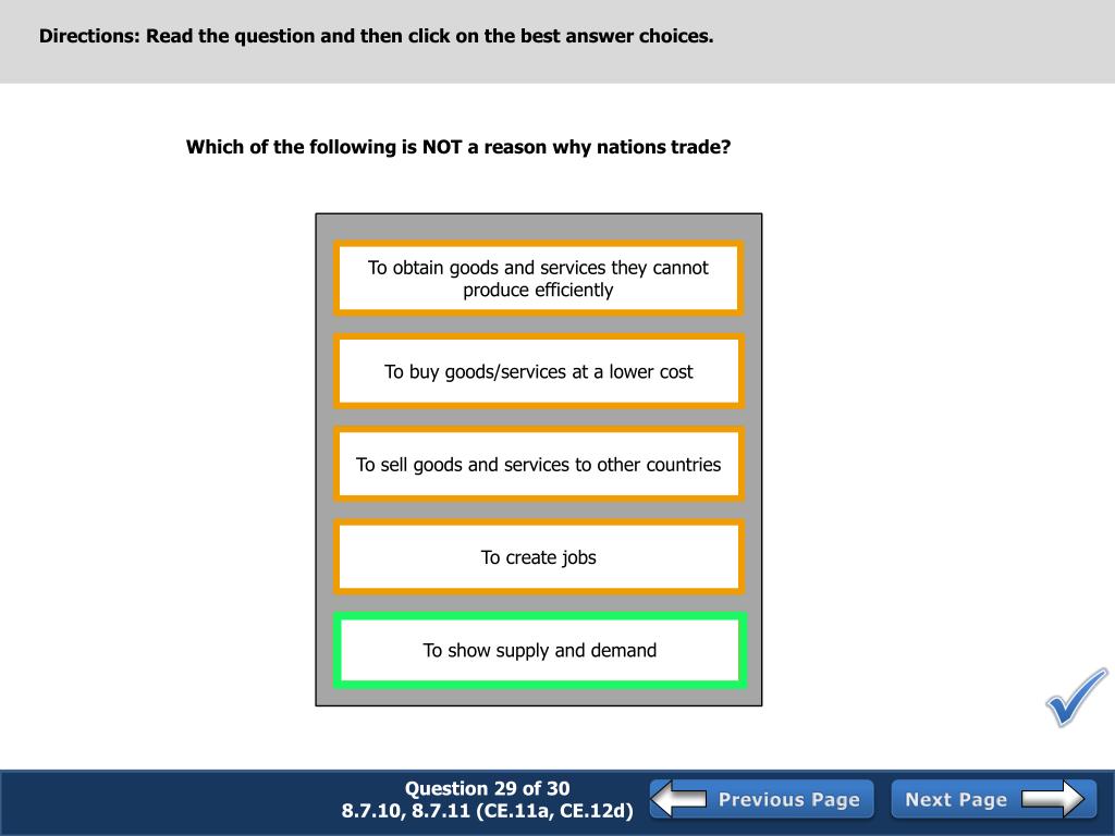 Directions: Read the question and then click on the best answer choices. Which of the following is NOT a reason why nations trade? To obtain goods and services they cannot produce efficiently To buy goods/services at a lower cost To sell goods and services to other countries To create jobs To show supply and demand Question 29 of 30 8.7.10, 8.7.11 (CE.11a, CE.12d) Previous Page Next Page
