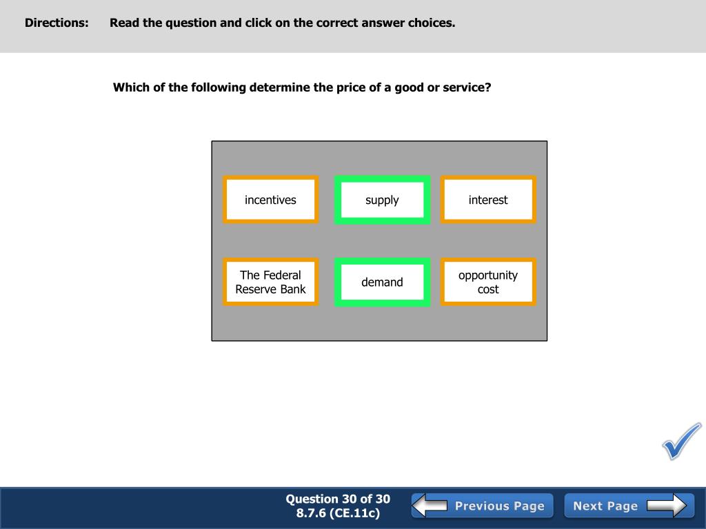Directions: Read the question and click on the correct answer choices. Which of the following determine the price of a good or service? incentives supply interest The Federal Reserve Bank demand opportunity cost Question 30 of 30 8.7.6 (CE.11c) Previous Page Next Page