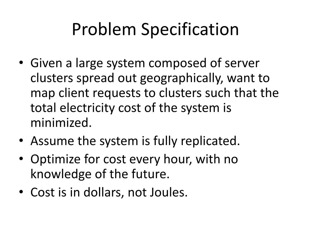 Problem Specification • Given a large system composed of server clusters spread out geographically, want to map client requests to clusters such that the total electricity cost of the system is minimized. • Assume the system is fully replicated. • Optimize for cost every hour, with no knowledge of the future. • Cost is in dollars, not Joules.
