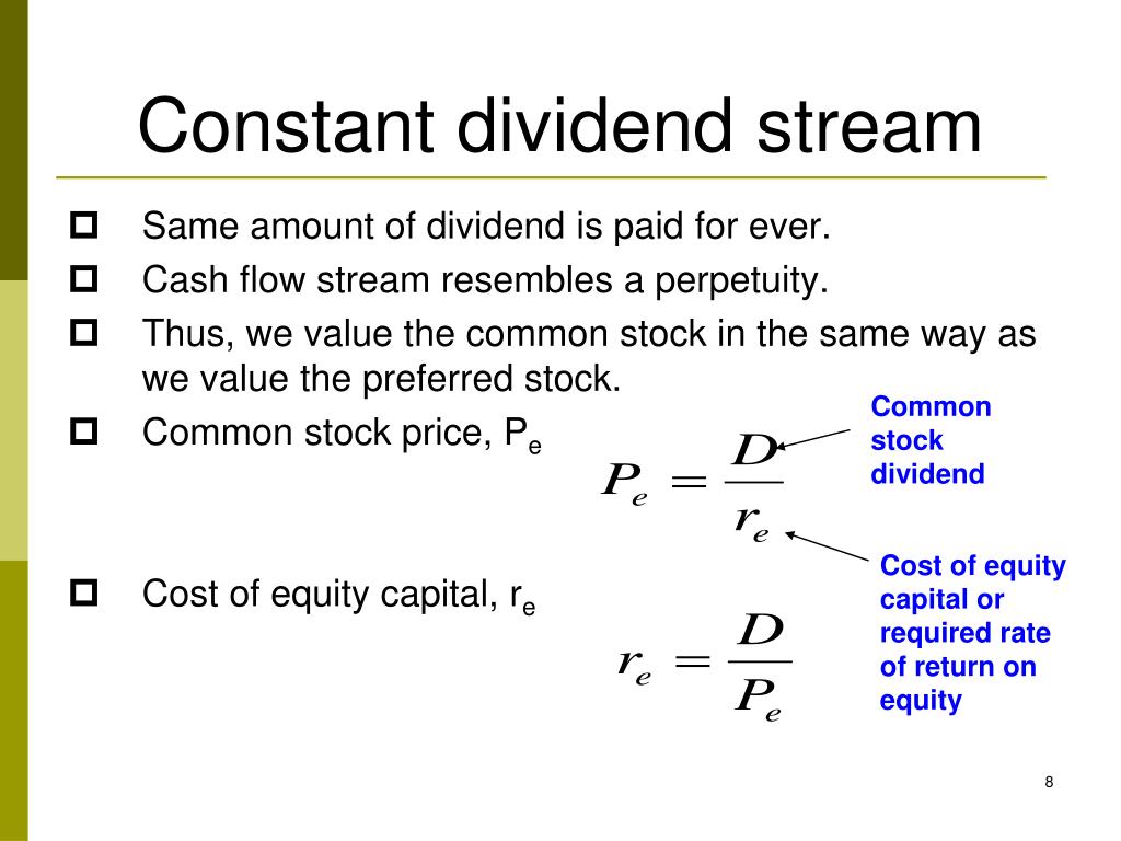 Constant dividend stream • Same amount of dividend is paid for ever. • Cash flow stream resembles a perpetuity. • Thus, we value the common stock in the same way as we value the preferred stock. • Common stock price, Pe • Cost of equity capital, re Common stock dividend Cost of equity capital or required rate of return on equity