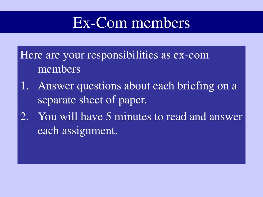 Ex-Com members Here are your responsibilities as ex-com members • Answer questions about each briefing on a separate sheet of paper. • You will have 5 minutes to read and answer each assignment.